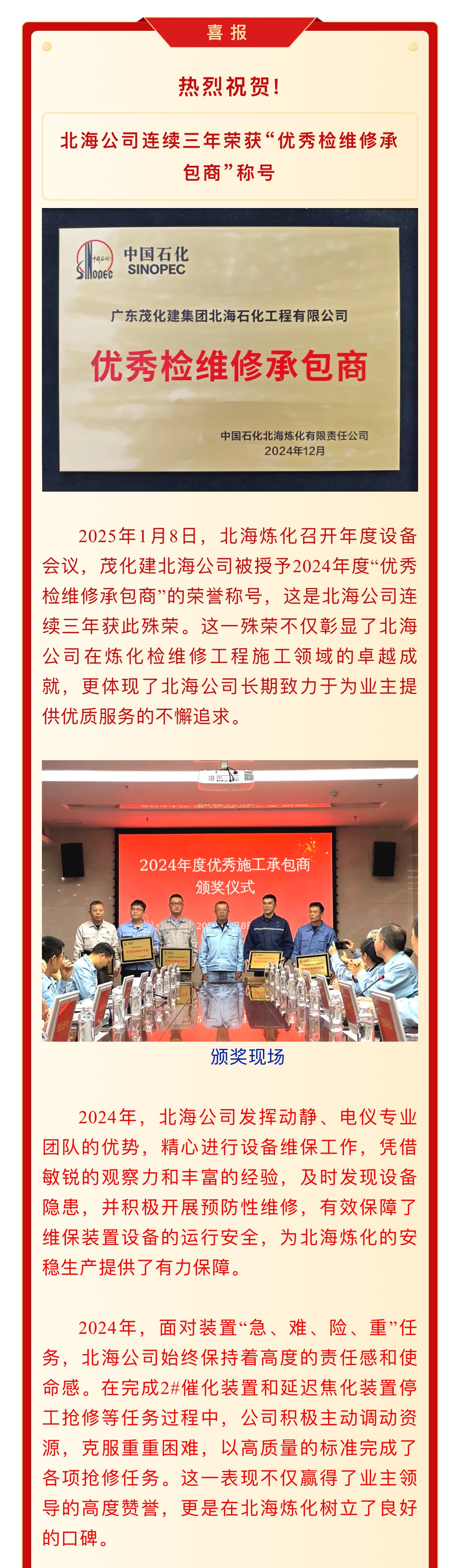 喜報:北海公司連續(xù)三年榮獲“優(yōu)秀檢維修承包商”稱號